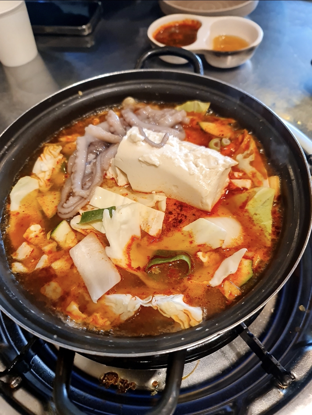 여기서 또 인상적이었던 건 서비스로 제공되는 순두부찌개입니다. 무료제공인데, 낙지도 한마리 올라가서 감동이었습니다. 곱창의 느끼함을 잡아주는 역할을 톡톡히 했어요.